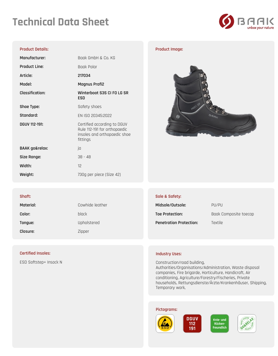 Winterboot Magnus-Profi2; Artigo 217034; EN ISO 20345:2022 S3S CI FO LG SR ESD, DGUV112-191; zíper YKK adicional; couro liso; forro de pele de cordeiro tecida; palmilha forrada; Sistema Baak®go&relax; Sola PU / PU; biqueira composta; proteção contra penetração têxtil.